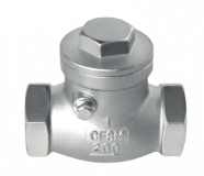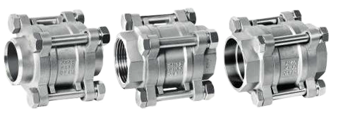 3-piece stainless steel check valve with spring mechanism, BSP threaded connections, Butt-weld ends or socket-weld ends, metal-to-metal sealing, and PTFE body seals.